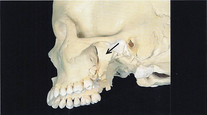 頭蓋骨側面の写真を別に示す。 矢印で示す部位に付着するのはどれか。1つ選べ。