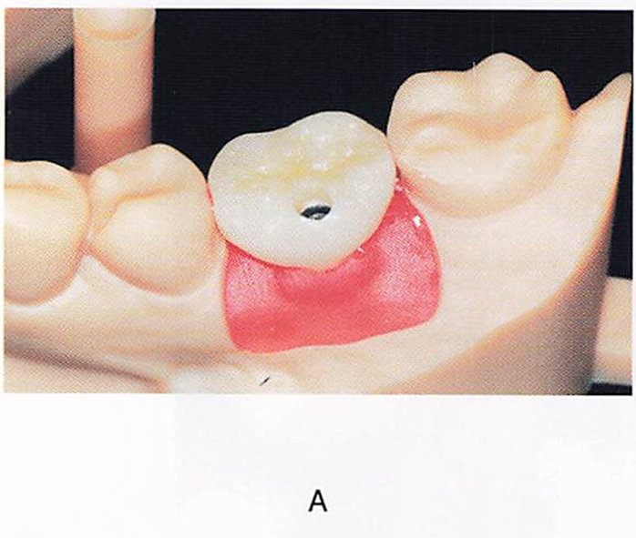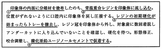 歯科医師から下顎左側第一小臼歯のオールセラミッククラウンの プロピジョナルレストレーションを製作するよう指示を受けた。支台歯形成前の印象体を使用して製作する場合の手順を図に示す。下線部分で正しいのはどれか。2つ選べ。