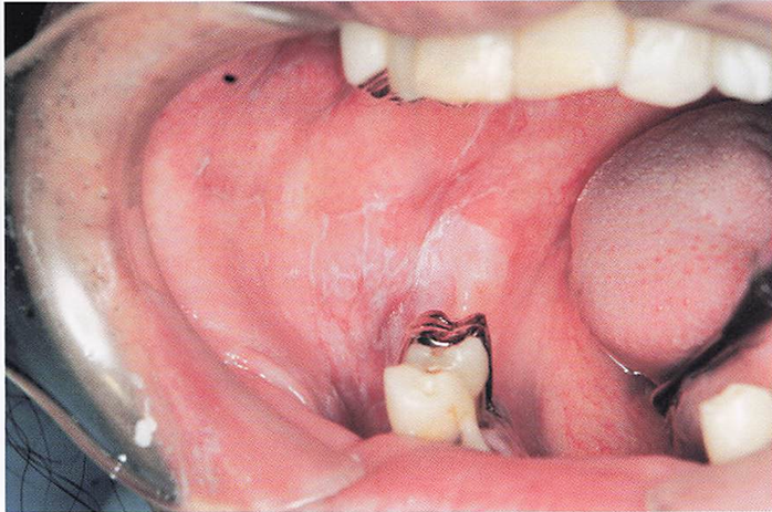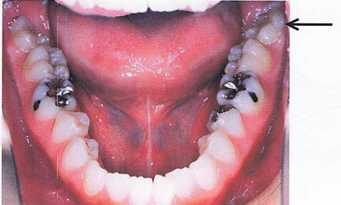 口腔内写真(別冊午後N。.2)を別に示す。矢印で示すのはどれか。1つ選べ。