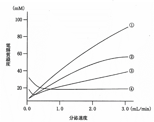 耳下腺唾液の電解質濃度と分泌速度の関係を図に示す。Na+はどれか。1つ選べ。