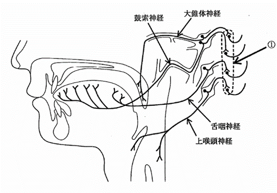 味覚の神経機構を模式図に示す。①で示す点線で囲んだ部位はどれか。1つ選べ。
