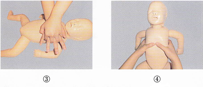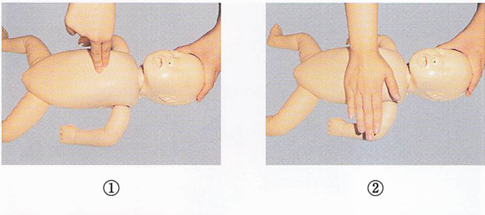 乳児の人形を使った一次救命処置における胸骨圧迫例の写真(別冊午後 No.45)を別に示す。 正しいのはどれか。2つ選べ。
