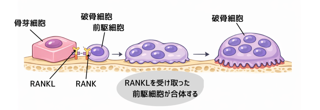 「破骨細胞が勝手に暴れだす」のではなく、実は骨芽細胞が指令を出している点がポイント